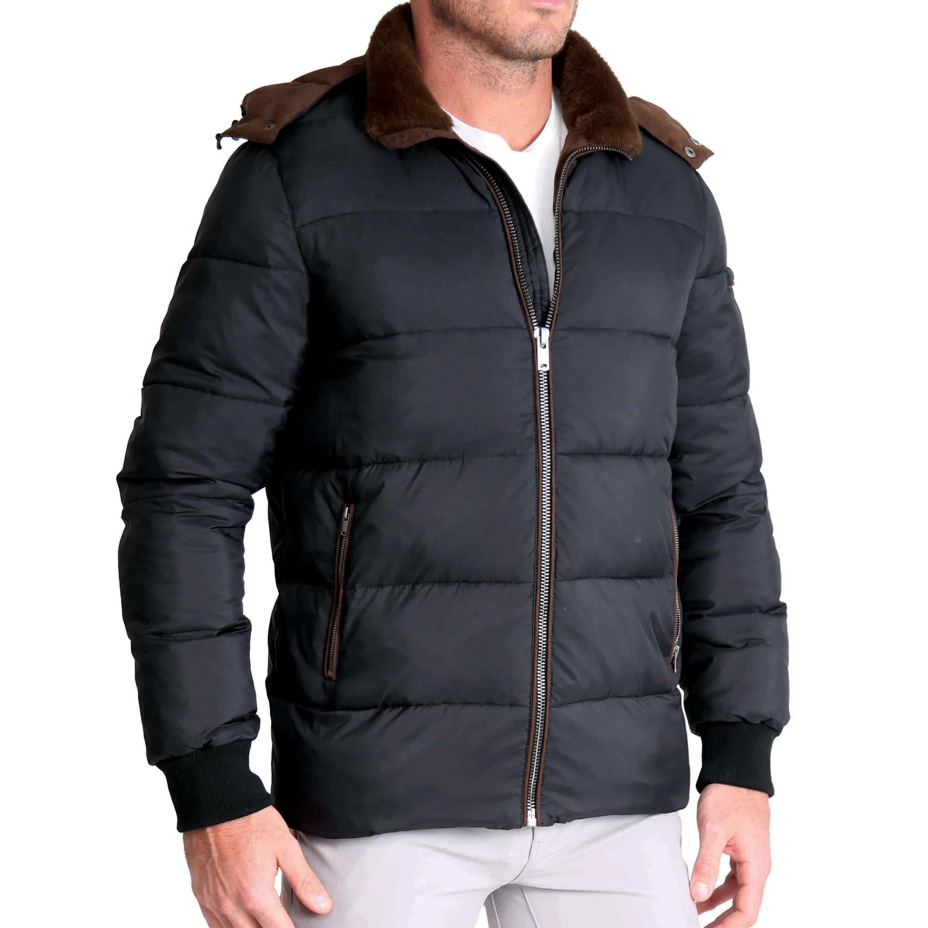 The Down Puffer Jacket that we sell will guarantee you stay warm this winter! This highly insulated and windproof heavyweight jacket is meant for cold climates. Not only will this keep you warm, but you will be very comfortable with the stretch fit lining inside of the jacket. A special feature of this jacket is the faux fur lined neck and the removable hood. This will give you the ability to have a couple different looks when owning this jacket.