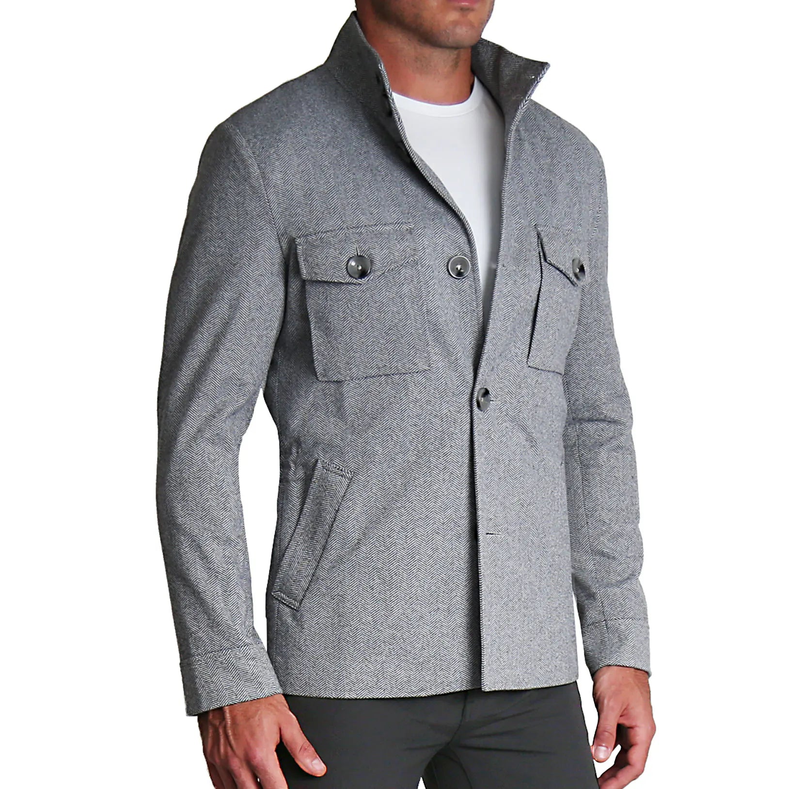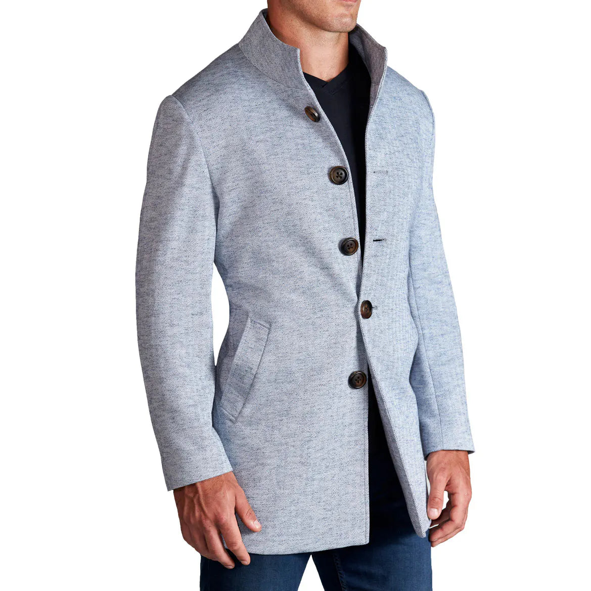 Our open button overcoat is one of our more professional looking coats. Also made with our signature athletic stretch fit, to help fit your athletic build. This jacket is more of a lightweight overcoat but still definitely capable of keeping you warm all fall and winter. The collar is built to give you the option to either fold it down or be worn up, making it versatile. This is our more dressy option for our coats, with the ability to keep you warm while also looking very professional.