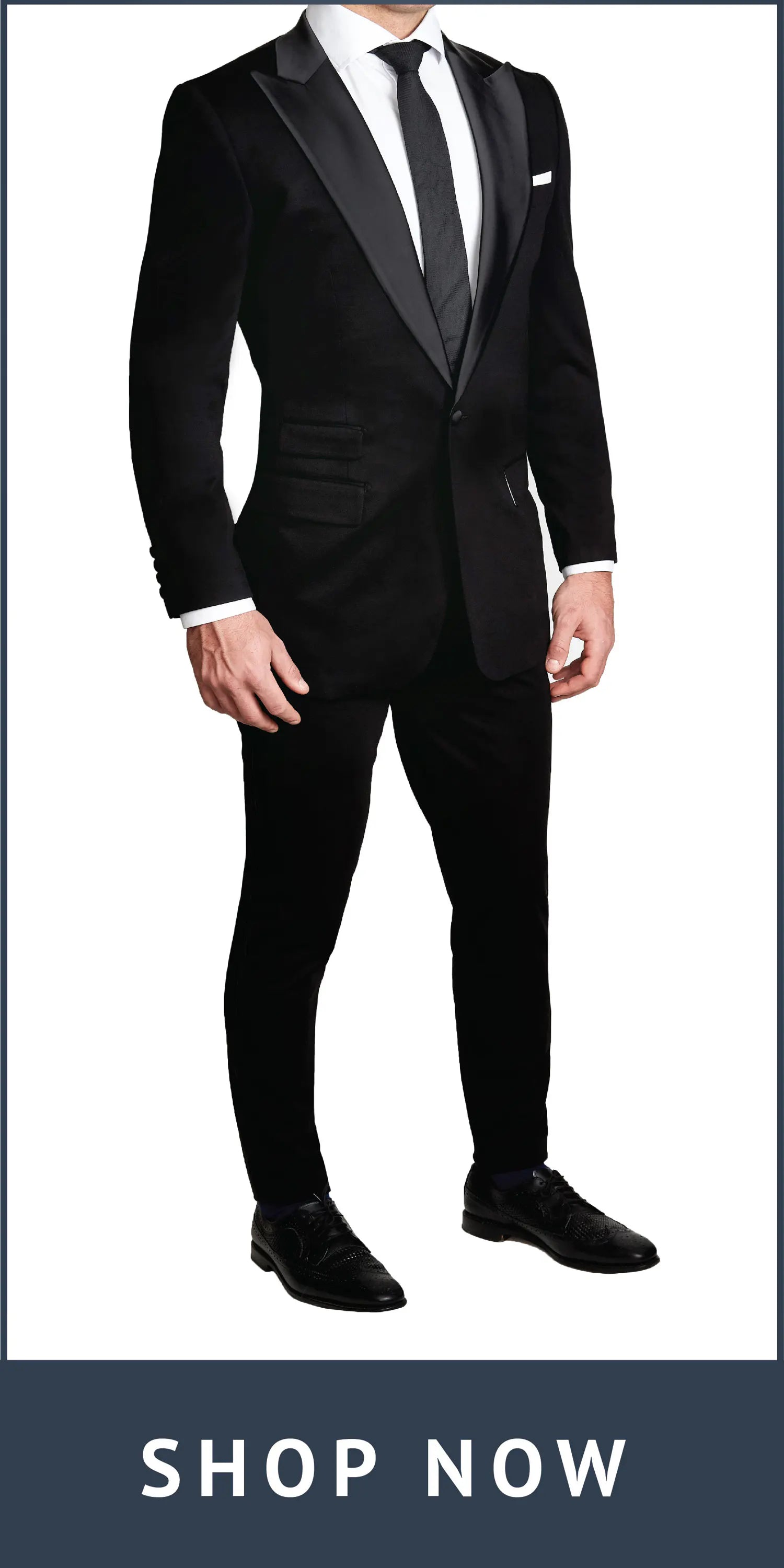 as our standard athletic fit suits, but with satin lapels for a perfect wedding look. Our stretch tuxedos look