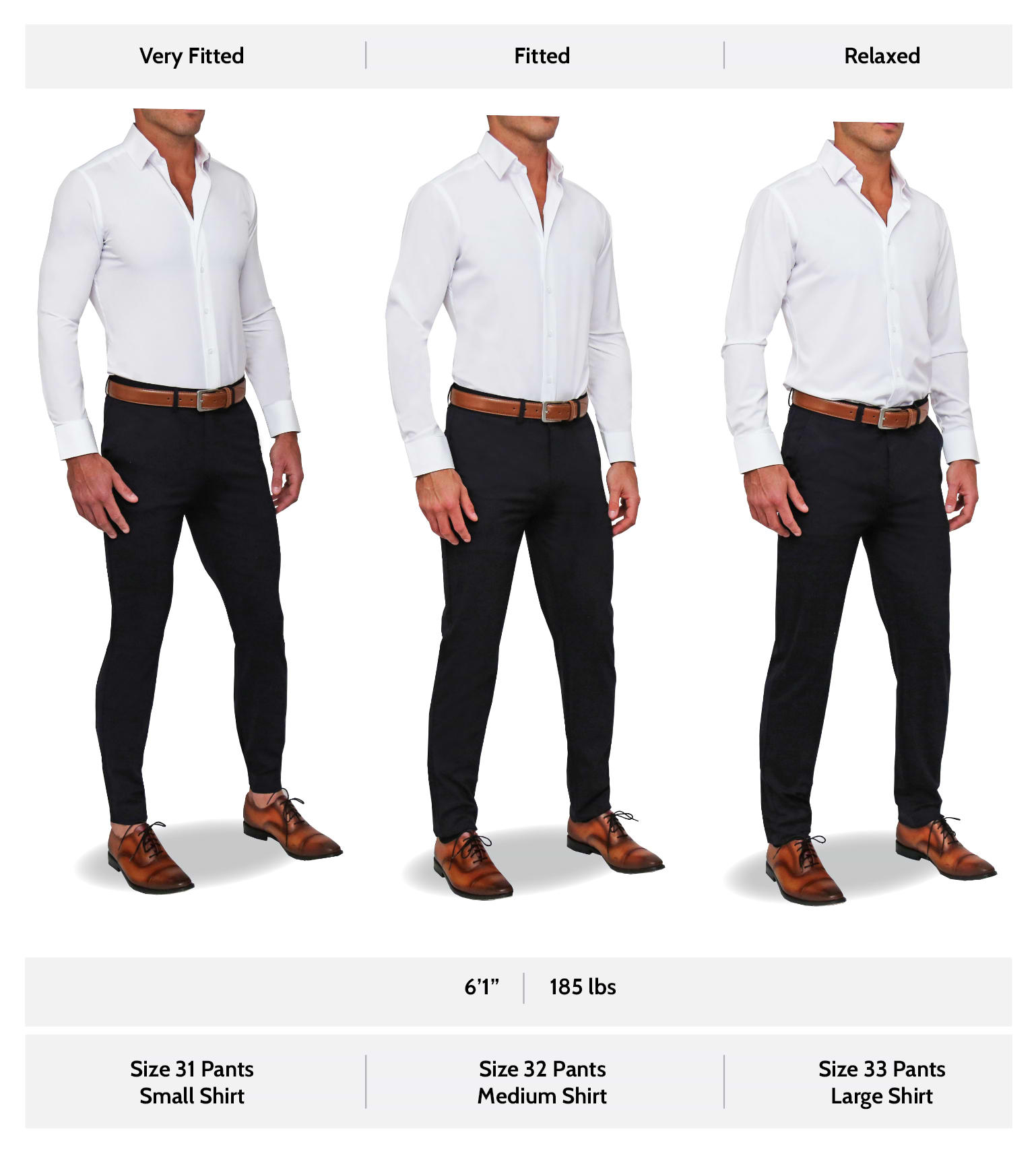 Our incremental size grading is a convenient visual of how to best choose your size based on your fit preference. Our size chart is specifically tailored to fit those who are looking for a "Fitted" look. However, by simply sizing up or down from our suggested size, you can achieve your desired fit preference.