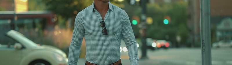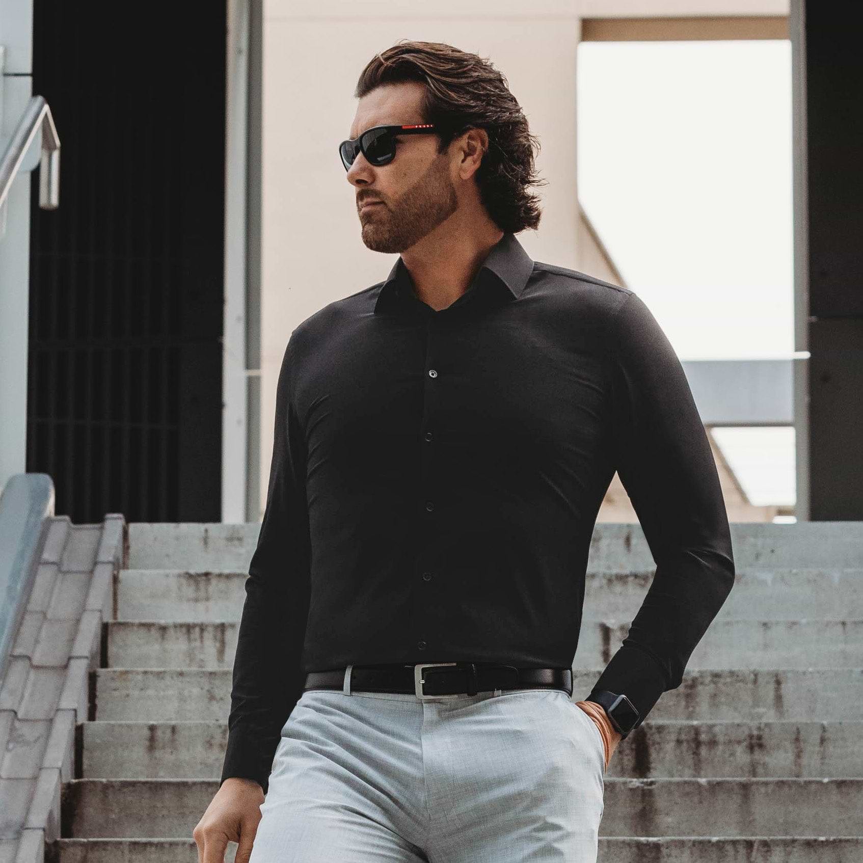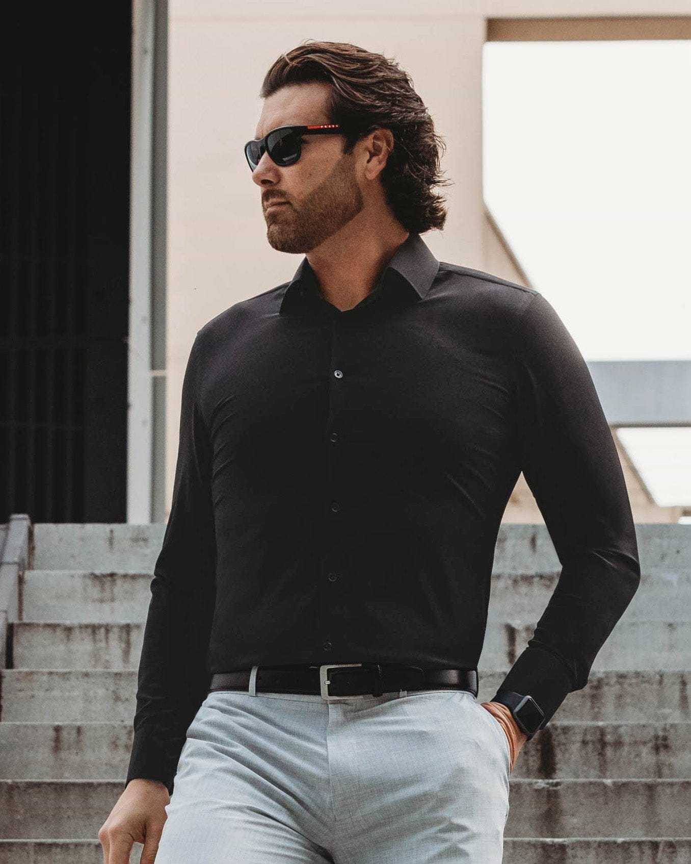 Stretch dress shirts with an athletic fit. These dress shirts are crafted from stretch, performance fabrics. With more room in the upper body and a tailored waist, these stretch dress shirts are designed for V-shaped body types. Stretchy, moisture wicking, wrinkle-free, machine washable, and no dry cleaning necessary. These stretch dress shirts will quickly become the only dress shirt you'll wear.